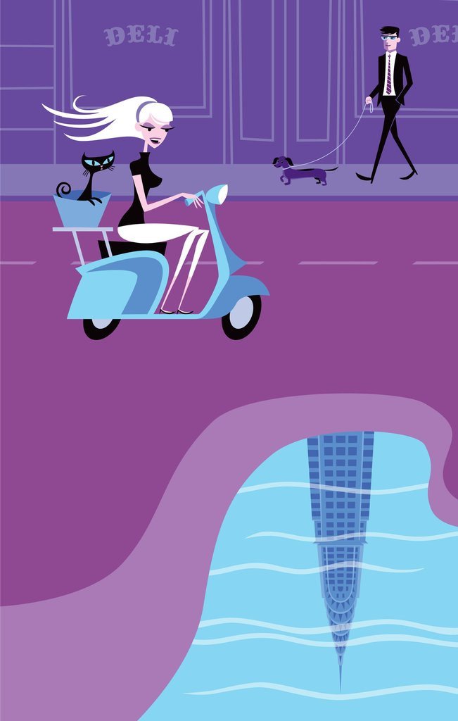 In Helsinki Syndromen (Helsinki Syndrome) a blonde lady relaxes in a 1963 Ball/Globe Chair created by Finish designer Eero Aarnio. The picture also includes The Puppy, a sculpture designed in 2005. Oddly, Helsinki syndrome is used in Die Hard and Babylon 5 instead of Stockholm syndrome but it is actually mentioned in the Nation magazine in 1985 as ‘Most feared of all Scandinavian disorders is Helsinki Syndrome, in which positively charged particles of information afflict the victim’s central ideological system, causing him to question America’s absolute moral superiority in the cold war. Specialists in the field refer to victims of the syndrome as being “Finlandized”, thus beyond recuperation”. La Dernière Pierre (the last stone) shows a well-dressed lady poised on a 1966 Ribbon Chair by French furniture and interior designer Pierre Paulin. In Seven Past Eleven the happy lady in white relaxes in front of a Marshmallow Love Seat #5670 (popularly known as the Marshmallow Sofa) produced by American furniture company Herman Millar. The sofa was designed by Irving Harper and originally attributed to George Nelson as was the practice for the company.