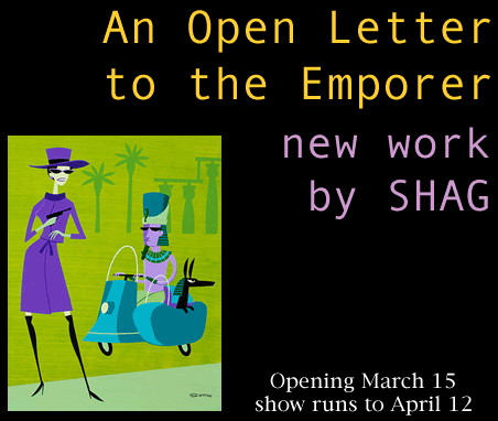 The exhibition An Open Letter to the Emperor ran at the Roq La Rue Gallery in Seattle, Washington from March 15th to April 12th 2002. The solo show of Josh Agle’s work included eight original paintings and thirty serigraph prints. The opening reception was held from 6 pm to 10 pm on Friday, March 15th 2002. All exhibited work was sold during the exhibition.