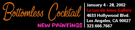The Bottomless Cocktail exhibition ran at the La Luz de Jesus Gallery in Los Angeles, California from January 4th to January 28th 2002. This was a show of sixteen new paintings by Josh Agle. Bottomless Cocktail was also the name of Josh Agle’s art book from January 2000 which included 60 full color pictures.