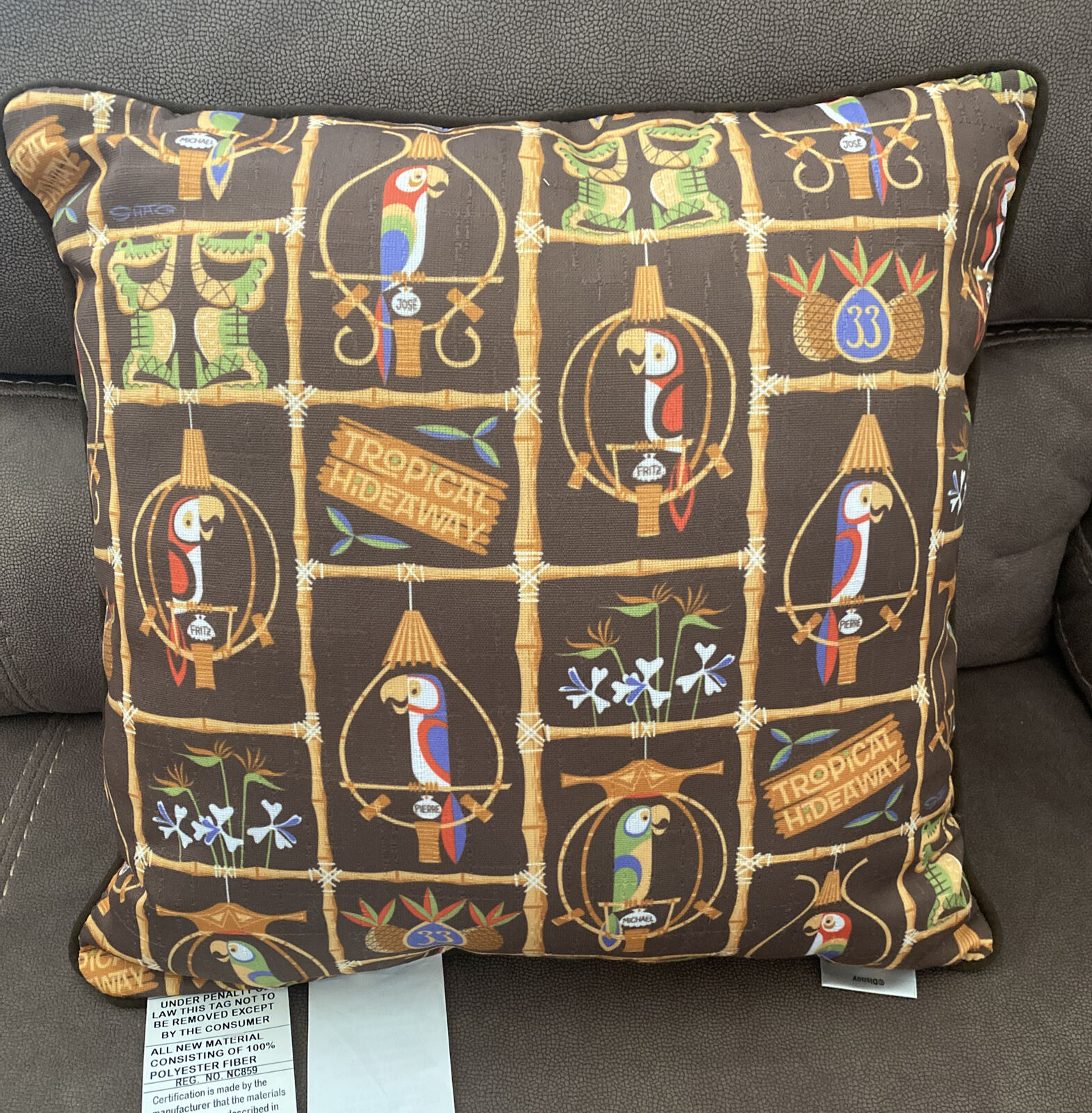 Size: 16″ x 16″ x 16″ Exclusive Disneyland Club 33 cushion, featuring the four parrots José, Fritz, Michael and Pierre from the Enchanted Tiki Room. Released in June 2023. |