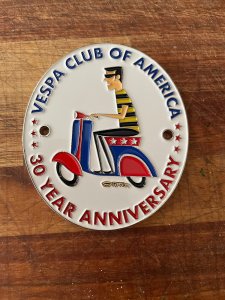 Vespa Club of America – 30 Year Anniversary Cog, Sticker and PinCog: 3″ tall x 1/8″ thick (with mount holes)Sticker: 3″Pin: 2″ (limited edition of 500 with two back posts to secure) |