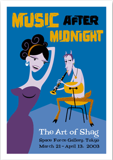 The Music After Midnight exhibition ran at the Space Force Gallery in Tokyo, Japan from March 21st to April 13th 2003. This solo exhibition of Josh Agle’s work included seventeen original acrylic and vinyl paint on wooden panel paintings plus an exclusive show print.