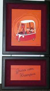 The Krampus & Christmas group art show ran at the Copro/Nason Gallery in Santa Monica, California from December 11th 2004 to January 15th 2005. The opening reception was on December 11th 2004 from 7pm to 11:30pm. The exhibition included rare original Krampus cards from the collection of Monte Beachamp, publisher of Blab magazine and publisher of The Devil in Design: The Krampus Postcards. Shag’s piece for the exhibition was Krampus Wagon.