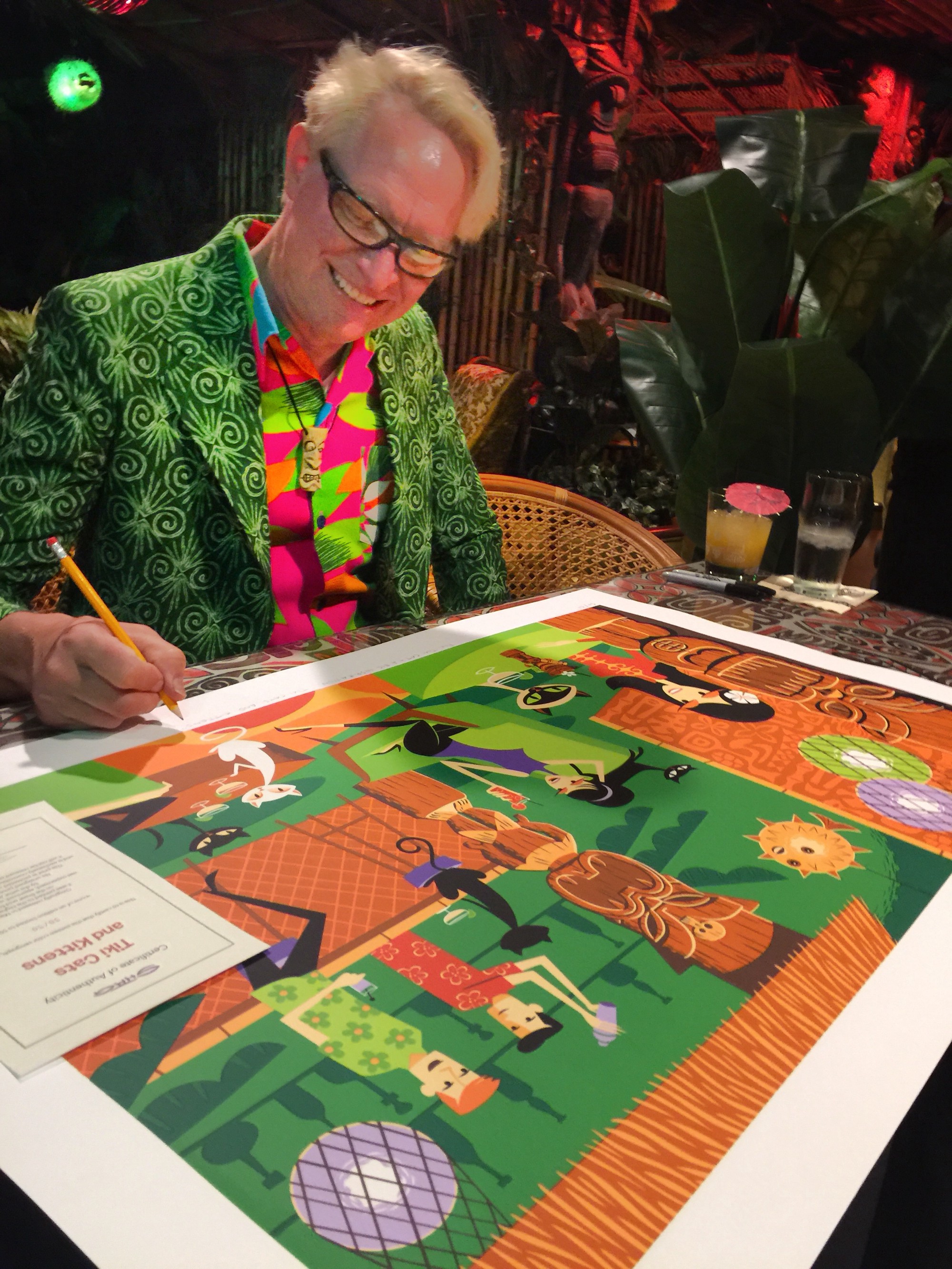 Shag attended the Tiki Cat and Kittens release party at the TikiCat Tiki bar in Kansas City, Missouri from 4 pm to 5 pm on May 13th 2017. The sixteen-color serigraph print measures 34″ by 20″, was exclusive to the bar, limited to fifty copies, and cost $500 USD.