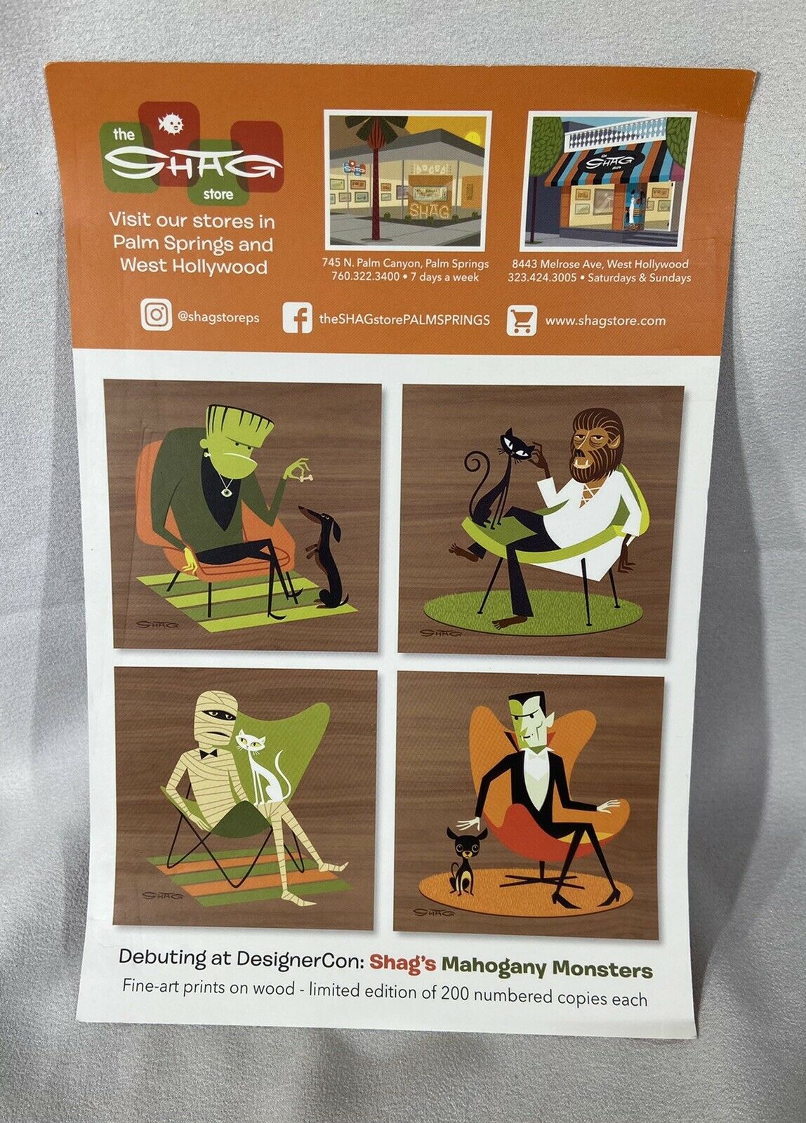 Shag released the four Mahogany Monsters limited edition mini-prints at DesignerCon 2018. The 5″ by 7″ images are printed on plywood and are named The Wayward Wolf, The Undead Count, The Greenish Monster, and The Dead Pharaoh. The signature on the front is printed, with a rear sticker showing the print name and edition number. The mini-prints are easy to hang with a built-in keyhole mounting for nails.