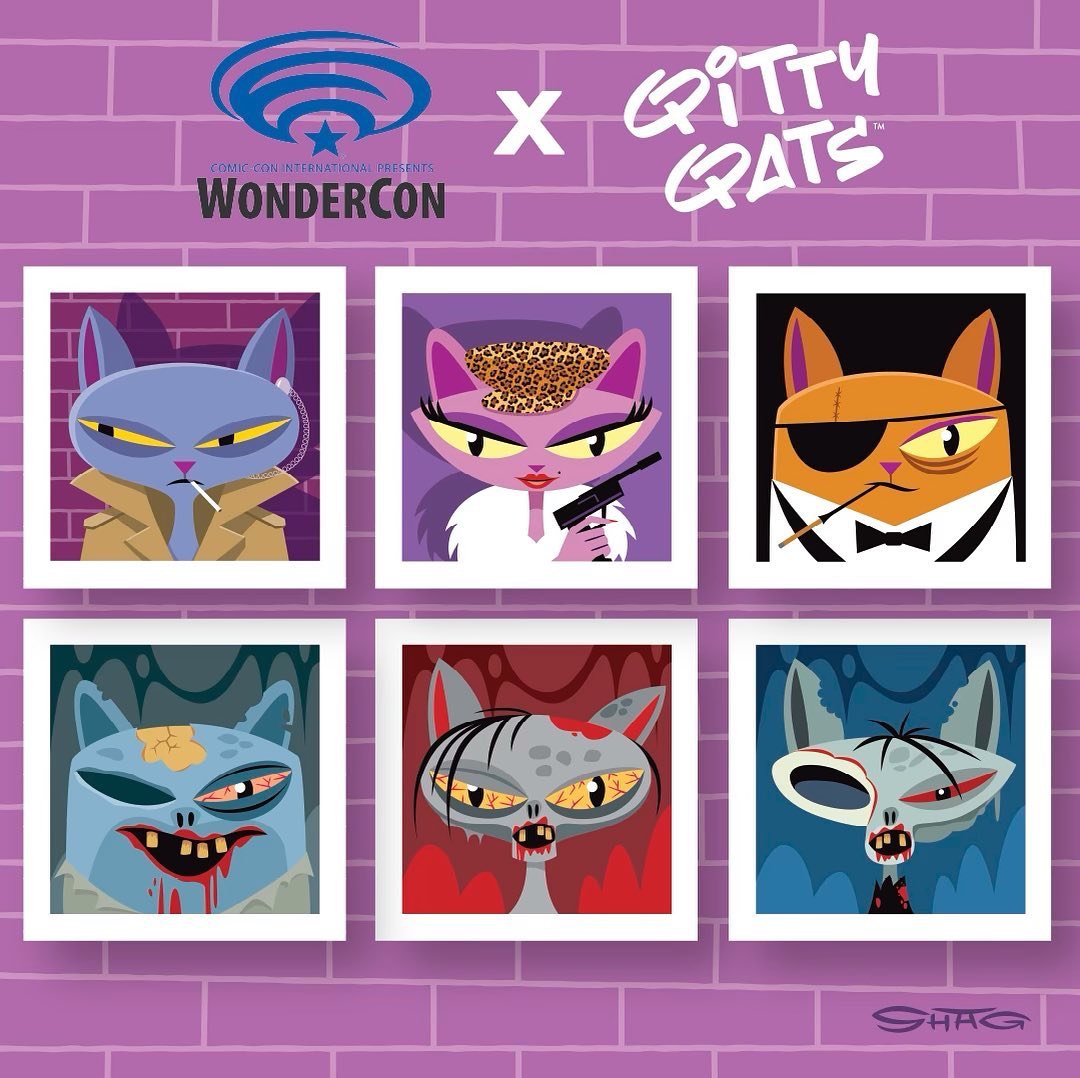 Shag’s QittyQats NFTs were at Wondercon 2022 at the Anaheim Convention Center in California from 1-3 April 2022. The limited-edition print and NFTs (each in an edition size of 10) were sold at ECHO Labs on booth 1437 in the middle of Hall B.