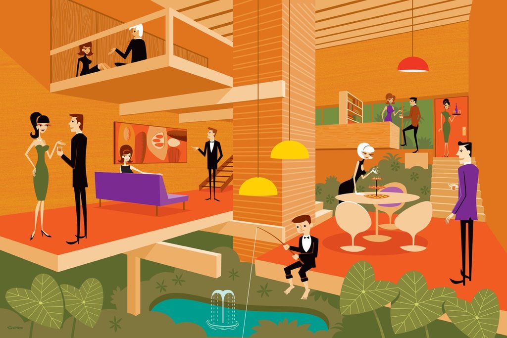 Outbound with the In-Crowd marked Shag’s 2012 return to Australia with a three-city tour. In his seventh solo exhibition at the Outré Gallery, Josh Agle relives his jet-setting fantasies of international travel. The exhibition also marked the release of the second edition of the Supersonic Swingers book from Outré Gallery Press.