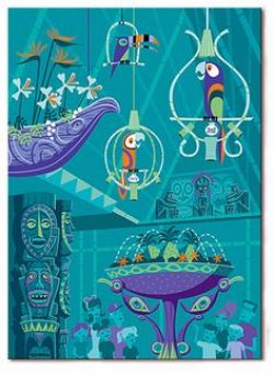 Size: Giclée 27″x20″, Deluxe Print 14″ x 8″ Original Cost: Giclée $325 USD The painting was released as a limited edition giclée (200 copies) and an open edition double-matted print. Released at the Walt Disney’s Enchanted Tiki Room 50th Anniversary event on 28-29 June 2013. Giclée. “On hot summer days, Walt Disney’s Enchanted Tiki Room offers a magical, cooling, and calming oasis for the Disneyland guest. Unchanged since 1963, the Tiki room still gets kids to squeal in delight and adults to relive their childhood.” — Shag |