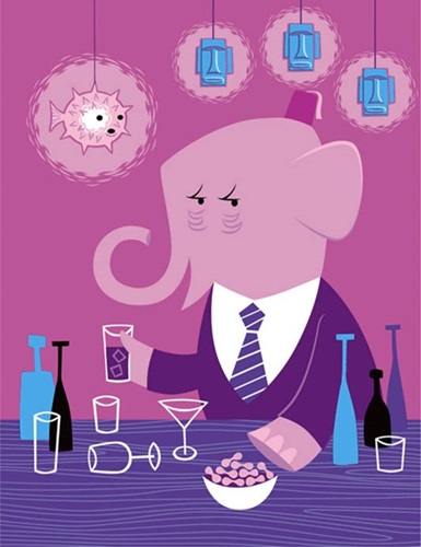 Original only. From Animal Kingdom show at the Corey Helford Gallery. “One bottle and two glasses sit on the table. She’s been waiting a long time for him to arrive. Slowly she comes to the realization that Craigslist is not the best place to meet a man.” |