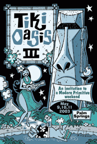 The Sultry Evenings exhibition was held at the M Modern Gallery in Palm Springs, California from May 9th to June 2nd 2003. This solo exhibition of Josh Agle’s work opened on Friday May 9th with an artist reception and booksigning from 7pm to 9pm. The show of rare artist proof prints (plus tiki glasses, mugs, and a handbag) was run in conjunction with Tiki Oasis 3.